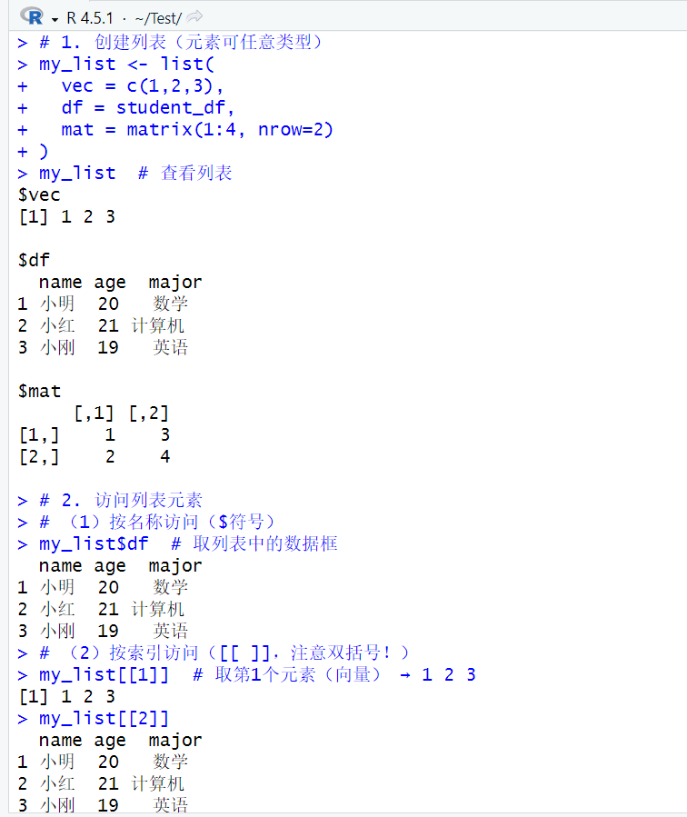 | 列表(List) | 1 维 | 混合类型 | 可存放向量、矩阵、甚至列表 | list() |
