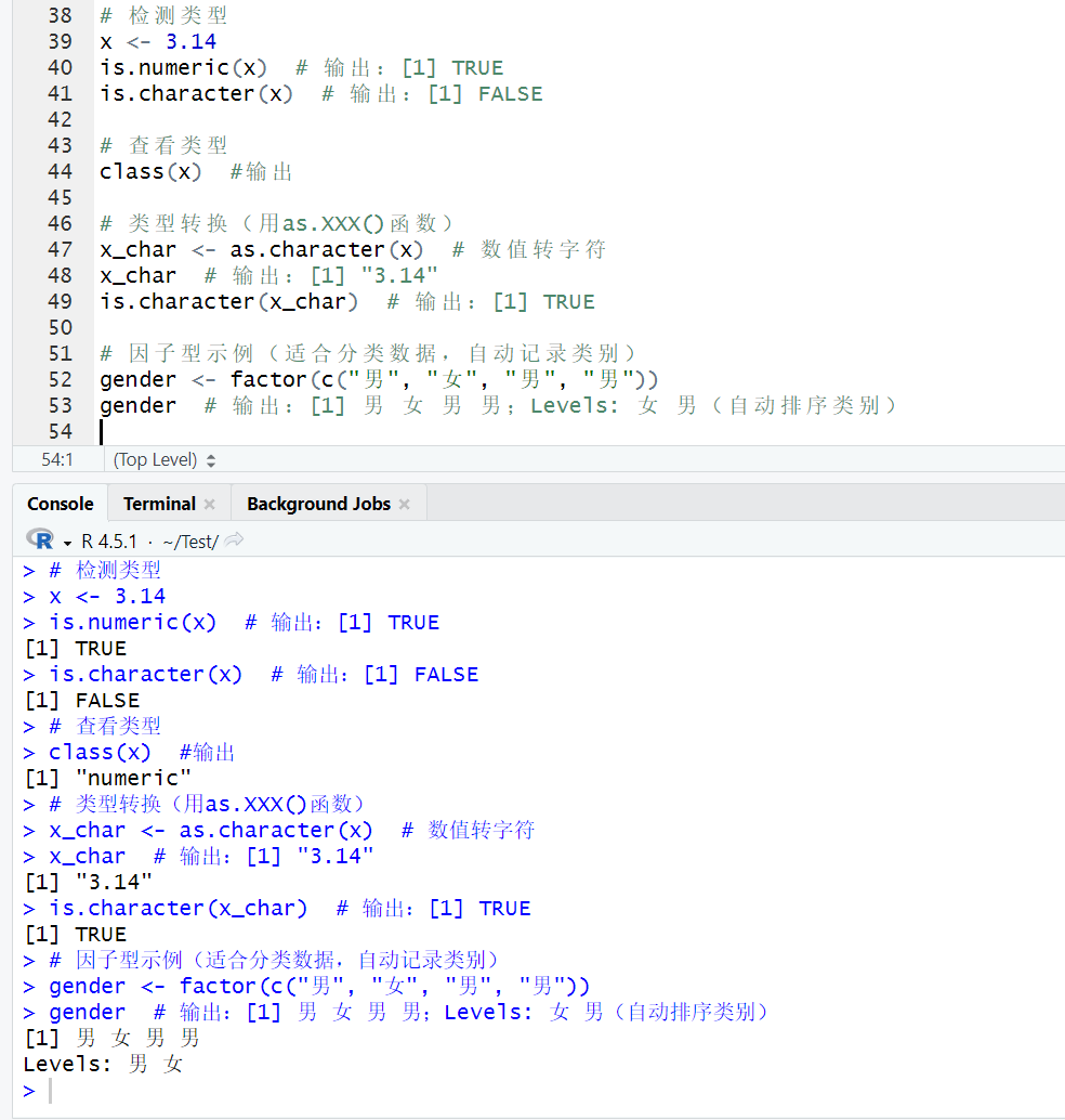 | 数值型(numeric) | 整数 / 小数(默认类型) | 10、3.14 | is.numeric() |