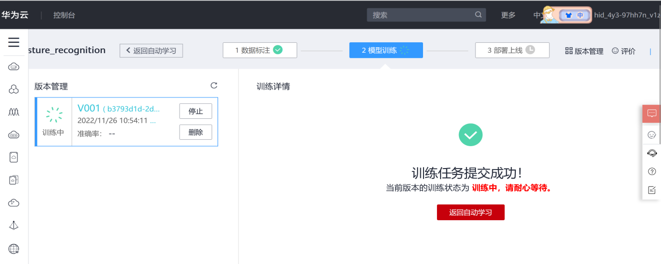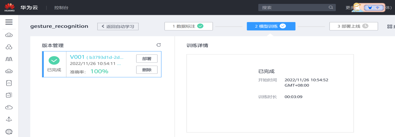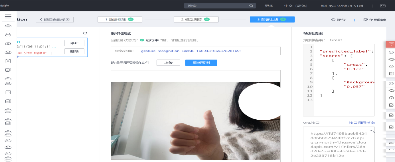 2.参考学习赛流程,利用数据集(gesture_recognition_data.zip)在ModelArts开发平台训练一个可以识别不同的手势模型(Yeah,Rock,OK,Great,Other)