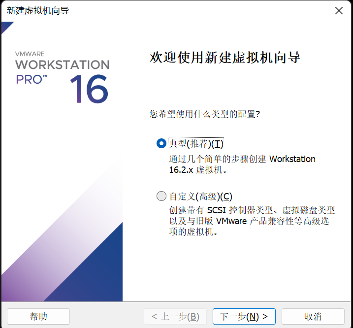 4.以上准备已就绪,下面正式使用虚拟机软件安装Linux操作系统。在VMware Workstation 16Pro主页单击创建新的虚拟机按钮,在新建虚拟机向导界面按照如图步骤依次进行。