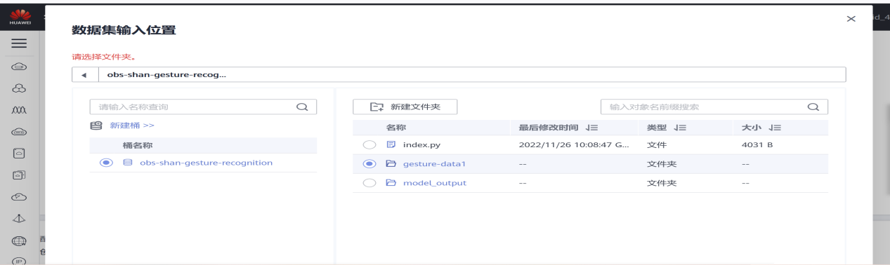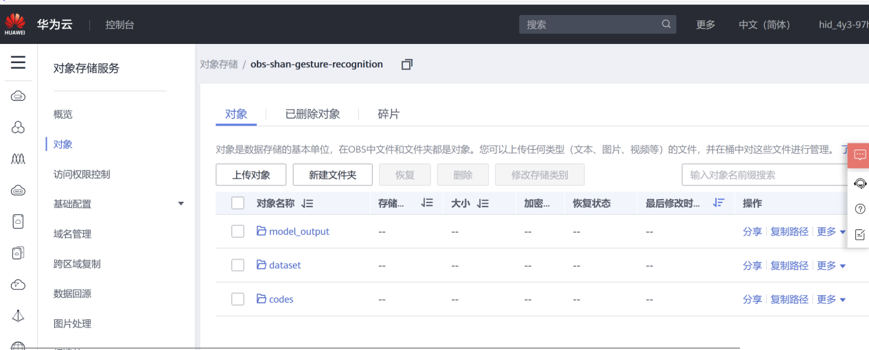 在OBS桶列表单击桶名称,然后单击左侧导航栏中“对象”,单击页面中“新建文件夹”,自定义文件夹名称后,单击“确定”。 新建一个文件夹(dataset)存放数据集数据集; 新建一个文件夹(codes)存放代码文件; 新建一个文件夹(model_output)存放训练输出的模型文件,结果图如下: