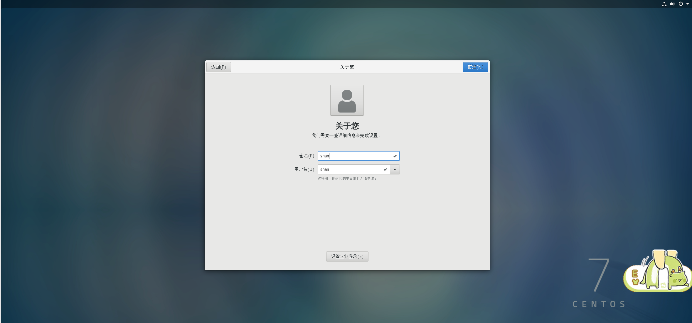 (6)总是单击前进按钮直至出现关于您界面,设置用户名和密码,如下图