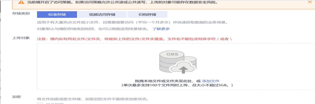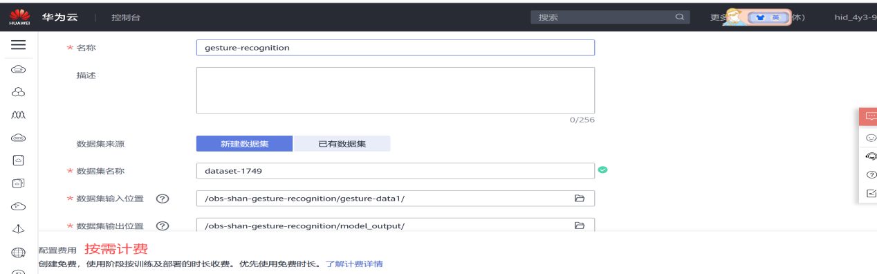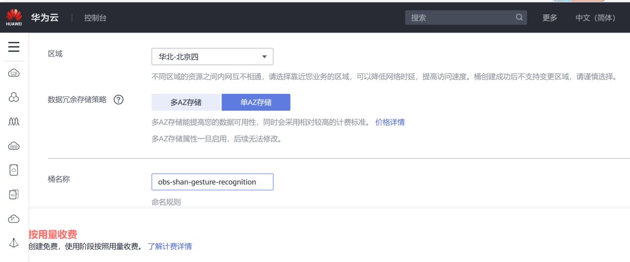 登录OBS管理控制台,单击页面右上方“创建桶”,在弹出的页面中选择区域、自定义桶名称,单击“立即创建”,并自定义参数(参数设置如下: a.“区域”选择“华北-北京四”;b.数据冗余存储策略选择单AZ存储;c.存储类别:标准存储;d.桶策略:私有;e.默认加密关闭;f.归档数据直读关闭;g.桶名称自定义为obs-shan-gesture-recognition)过程图和结果图如下: