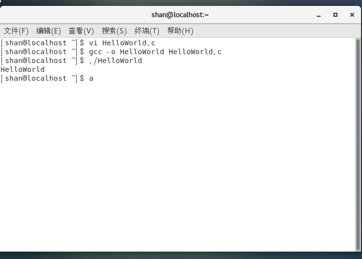 (9)编写HelloWorld:先在终端创建名为HelloWorld.c的文件,编写文件代码vi HelloWorld.c