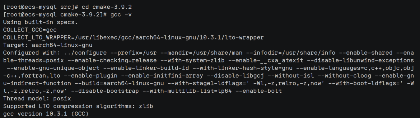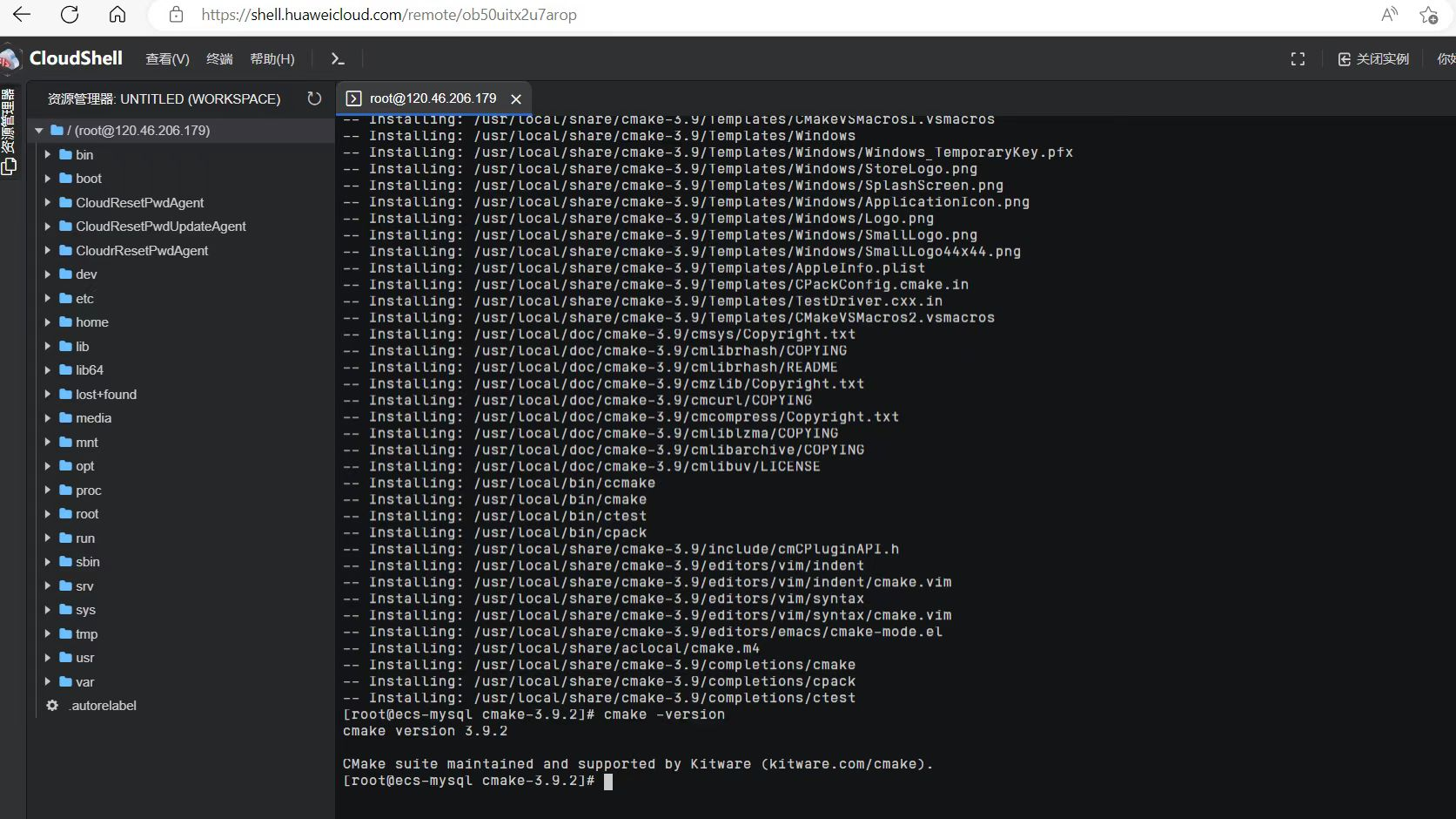 使用ecs-mysql右侧“远程登录”中的“CloudShell登录”,依次执行实验手册中的代码命令,完成CMake的安装。(安装完成图如下)