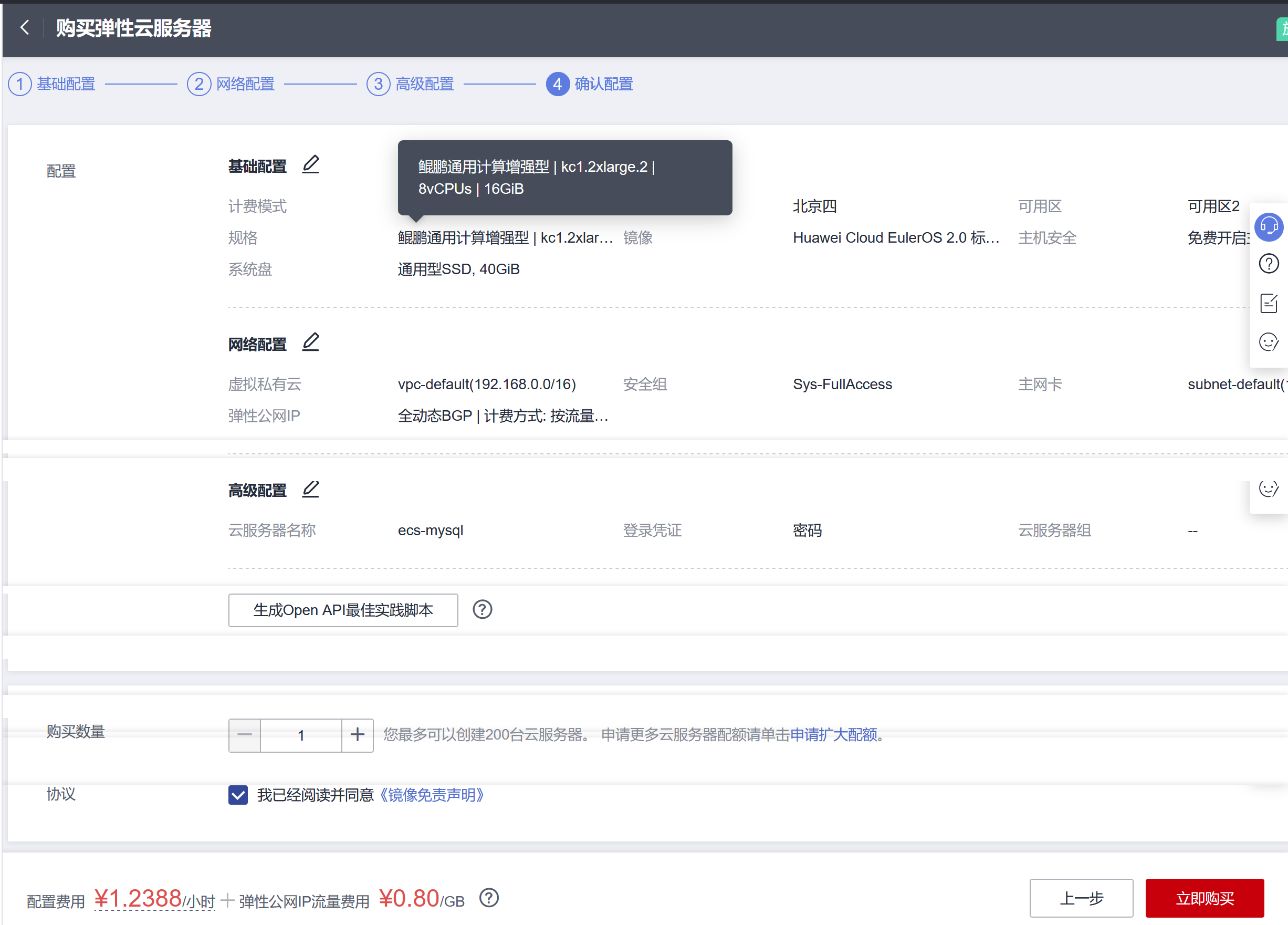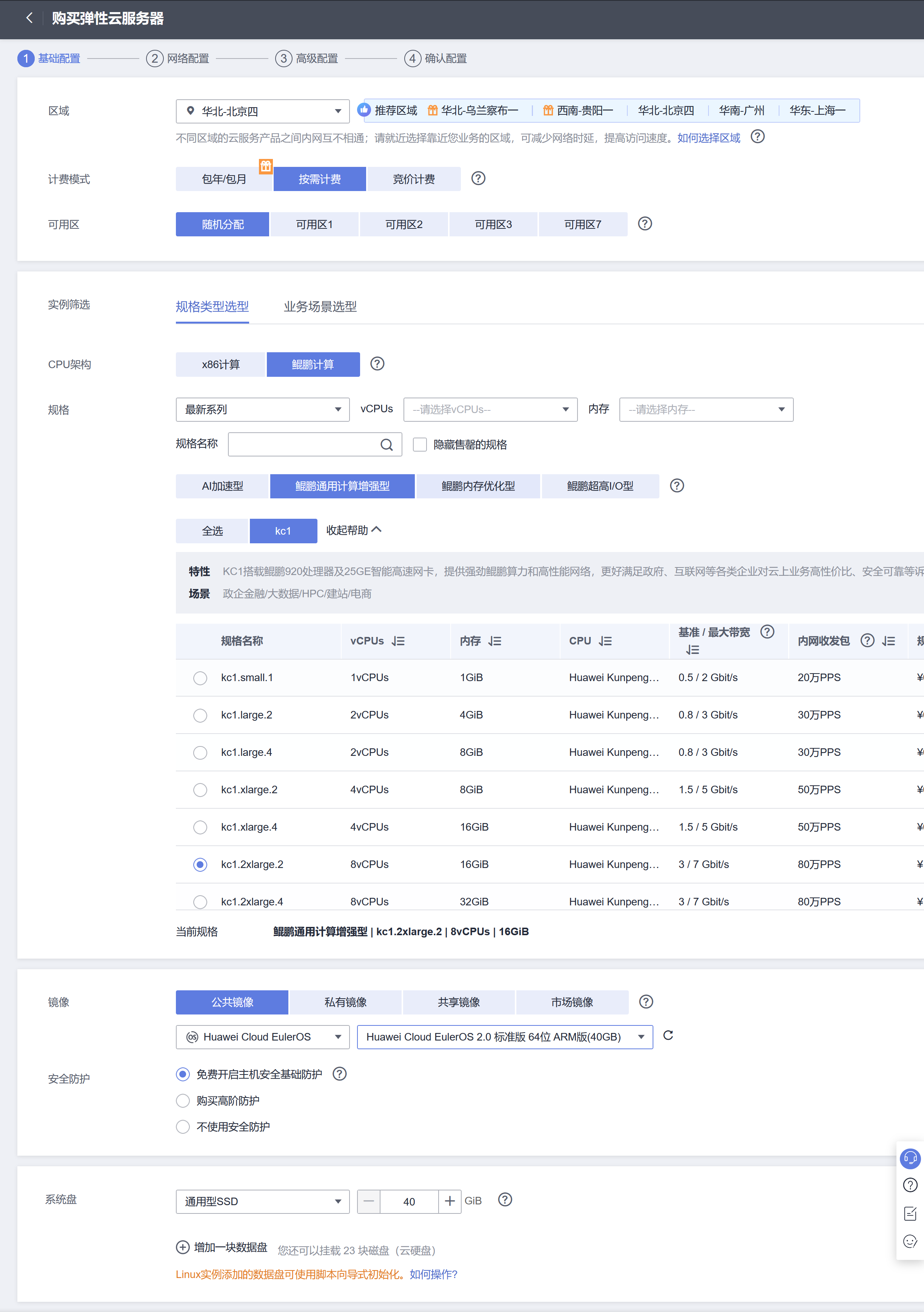 注:基础配置参数有一处发生改变kc1.xlarge.2 8vCPUs|16GB改为kc1.xlarge.2 2vCPUs|4GB