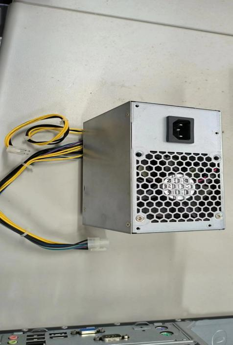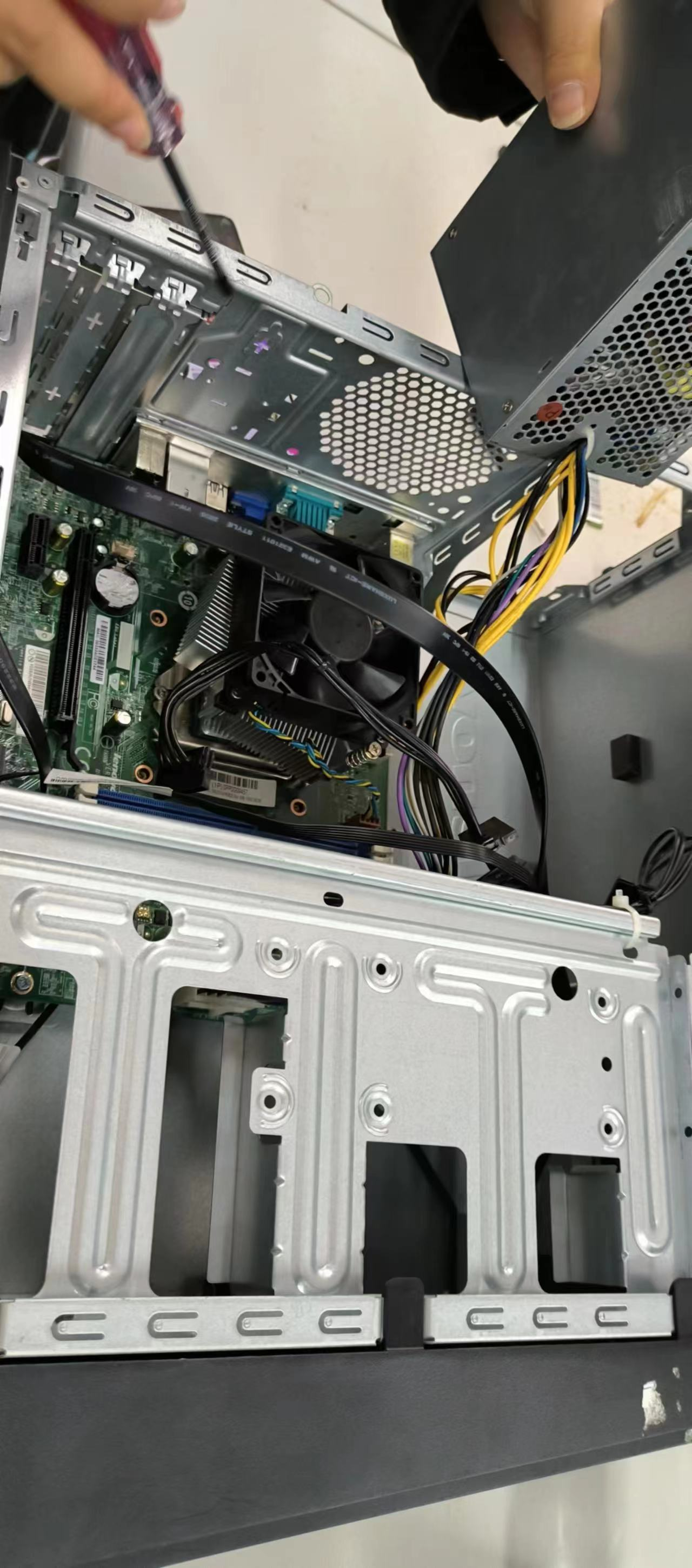 (2)安装电源:把电源放在电源仓内,使电源上的螺丝孔与机箱上的螺丝孔一一对应,然后拧上螺丝。