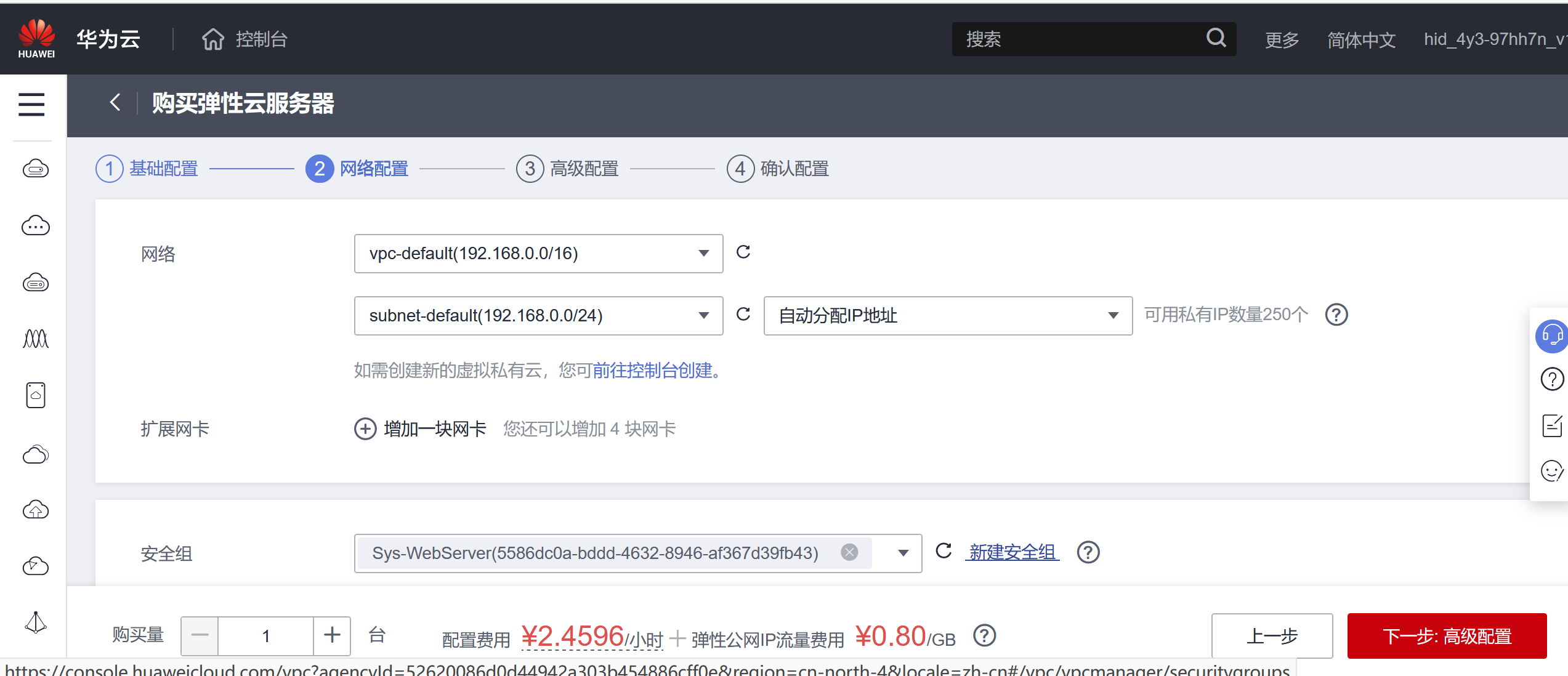 登录华为云账号 -> 单击右上角“控制台”进入控制台操作页面 ->单击页面右上角“购买弹性云服务器” -> 选择基础配置(参数详情如下图1)-> 网络配置(参数详情如下图2)-> 检查安全组中是否有“Sys-FullAccess”(检查结果:有,故无需新建安全组) -> 弹性云服务器高级配置(参数详情如下图3)-> 勾选同意协议并完成购买。