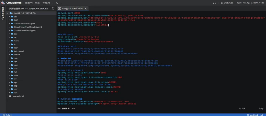执行以下命令,编辑应用配置文件(用户名:root 密码:********)