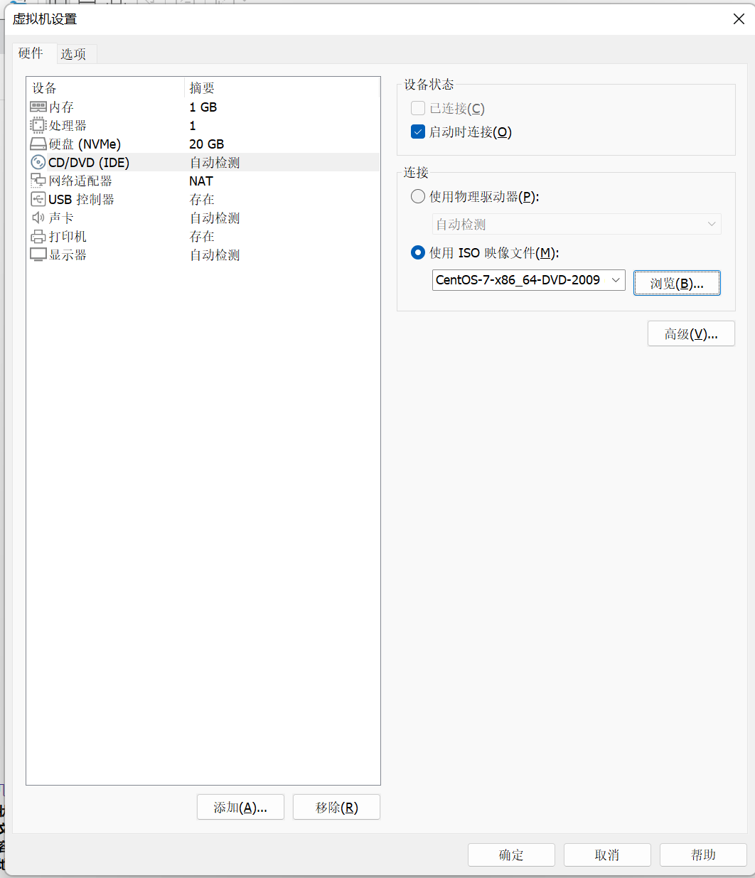 5.安装完成后,单击虚拟机设置按钮,点击虚拟机设置按钮,在硬件栏下设备栏单击CD/DVD(IDE),选择使用ISO映像文件选项卡,导入预备的压缩文件,单击确定。