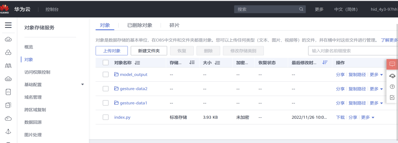 利用自己已有的数据集gesture_recognition_data.zip(在课堂派作业发布中下载)在OBS Browser+中对数据集进行上传。