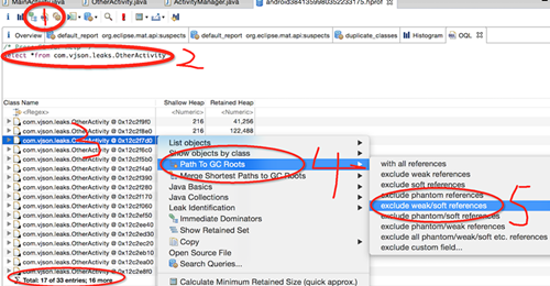 使用OQL对象查询语言查询出泄漏的对象,写过SQL的同学一定对她有一种既陌生又熟悉的感觉。和SQL很相似,语法简单易懂,可是很强大select *from com.vjson.leaks.OtherActivity赛选出OtherActivity这一类对象,然后选择“exclude weak/soft references”赛选出除了软引用和弱引用之外的对象,也就是强引用了!。对象的引用类型不在本文的解说范围,可是你一定要知道“强引用”,“软引用”。“弱引用”。“幽灵引用”,假设不知道自行脑补去吧!