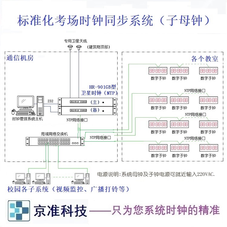卫星网络母钟的多路网口可向教室和办公室数字NTP网络子钟,也可同时向校园广播系统、安防系统、智慧教室系统、智慧图书馆系统、火灾报警系统、校园一卡通系统、校园信息管理系统等其他各个子系统的服务器监控主机提供标准时间信号。