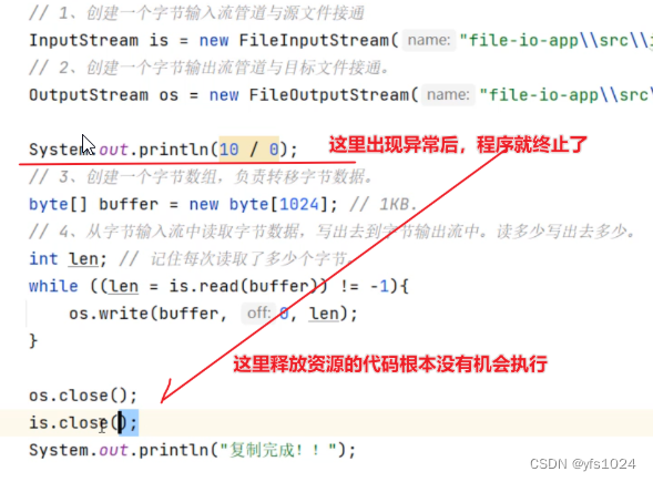 通过代码我们会发现关闭资源极其的麻烦。我们不仅仅要提高变量is 和 os 的优先级,而且还要写大量的try catch代码。尤其是在finally中。业务代码也就了了几行但是异常代码那~~~么多。所以在JDK之后就做一个改进。