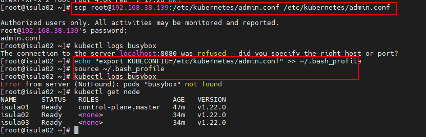 经过排查,发现在两个worker节点上都没有admin.conf文件: