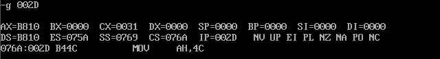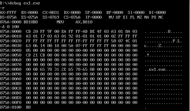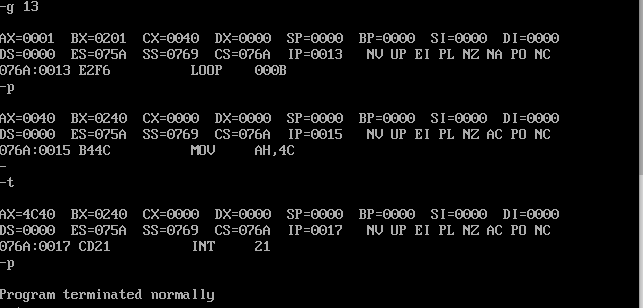 (2)汇编连接后,灵活使用debug的t命令、g命令、p命令调试,用d命令查看0:200之后的若干字节,观察是否将mov ax,4c00h之前的指令复制到指定内存
