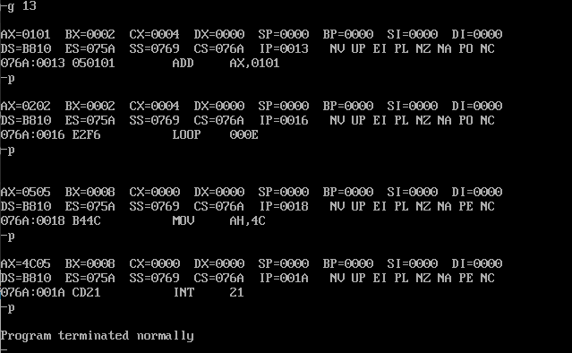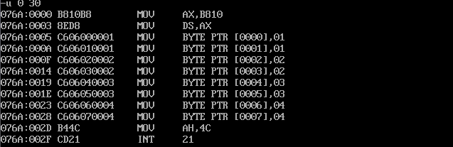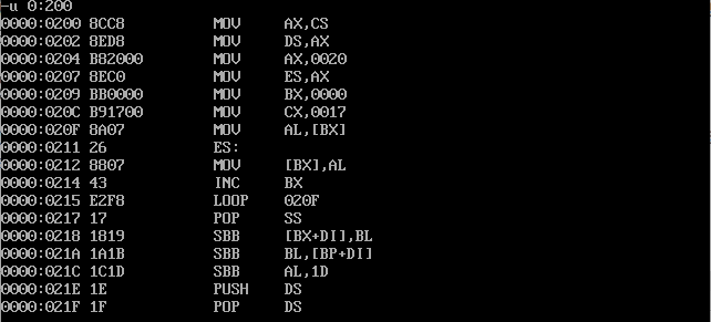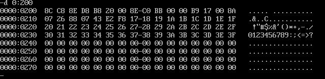 (2)汇编、链接无误后,灵活使用debug的t命令、g命令、p命令调试,用d命令查看0:200~0:23F,确认是否将0~63传送至此段内存区域。