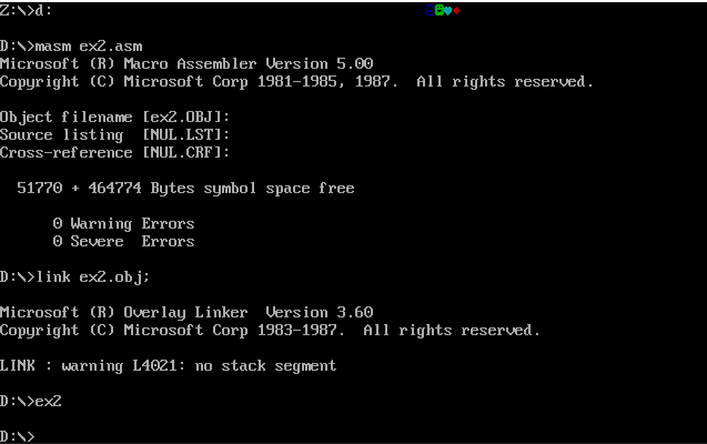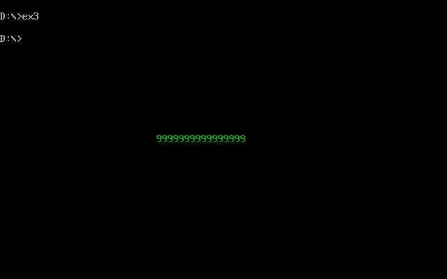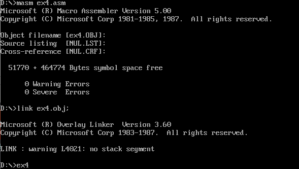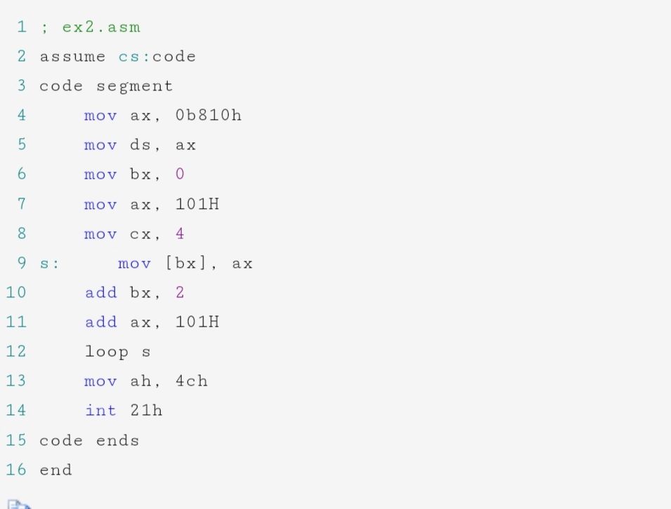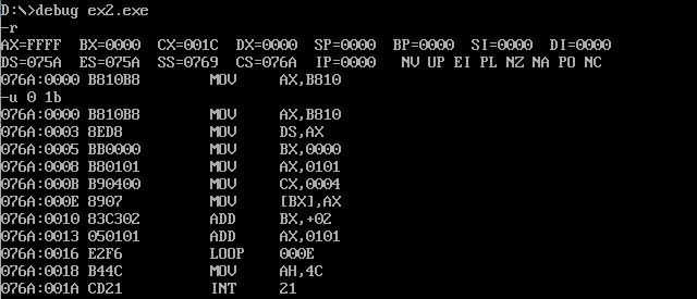 3)把ex2.asm中line9 mov cx,4改成 mov cx,8, 保存后重新汇编、链接、运行并观察结果。