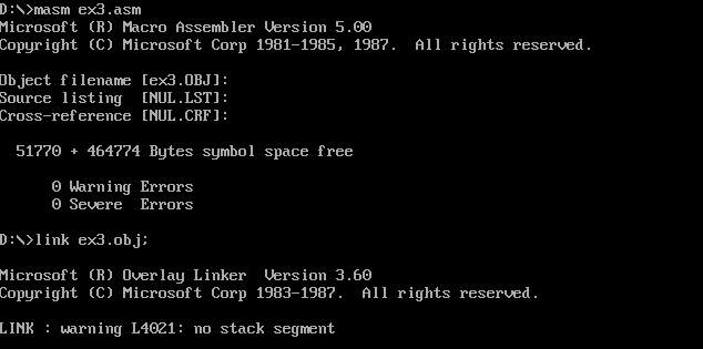 (2)给出使用masm、link工具汇编、链接的命令行及运行结果截图