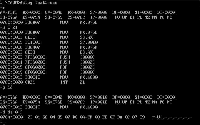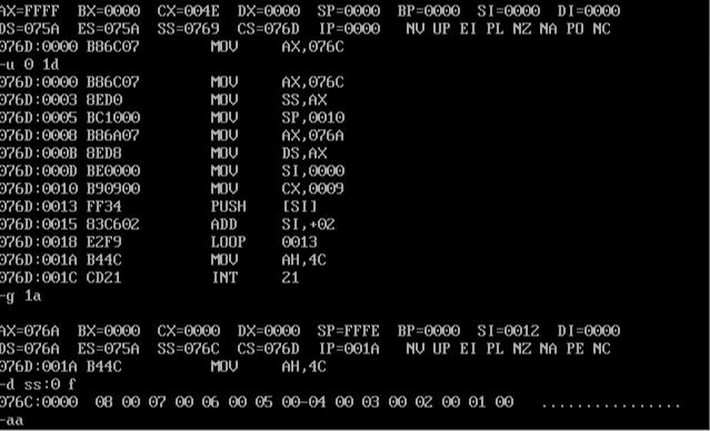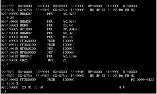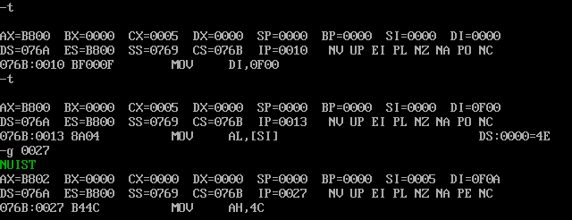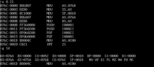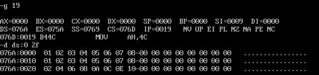 反汇编后得知程序在 001ah处返回,使用 -g 001a命令