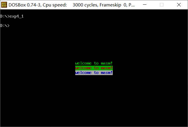 教材「实验9 根据材料编程」(P187-189)编程:在屏幕中间分别显示绿色、绿底红色、白底蓝色的字符串'welcome to masm!'。