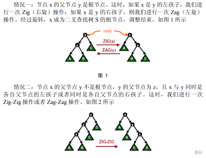 相比于普通 treap 的 zig 和 zag 操作,splay 多了“双旋”。即连续转两次:zig-zig,zag-zag,zig-zag,zag-zig。
