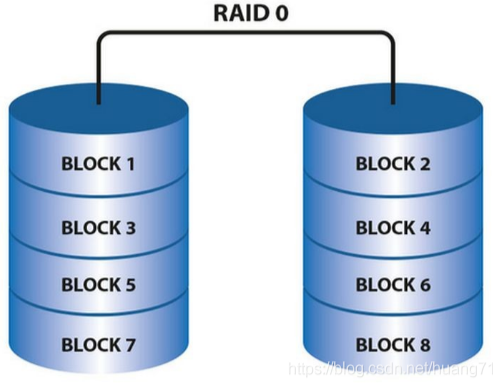 RAID-0条带卷,最少两块盘。读写性能好,但没有容错机制。坏一块磁盘数据全丢。