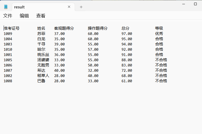 // 从文本文件examinee.txt读入考生信息:准考证号,姓名,客观题得分,操作题得分