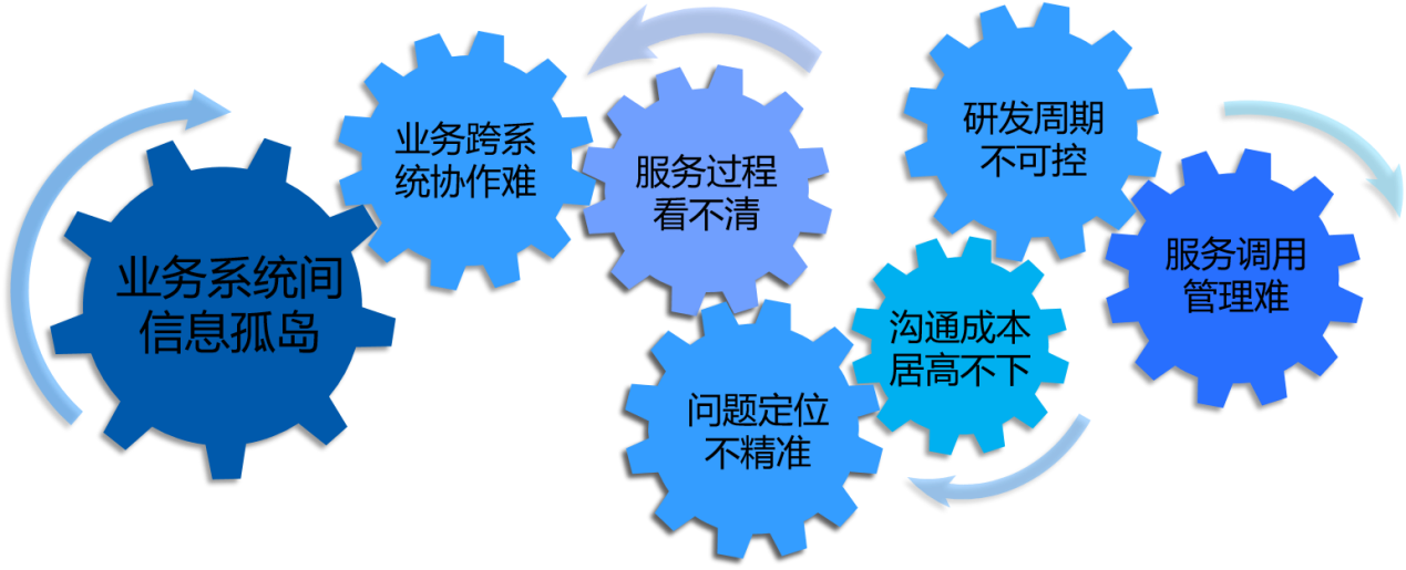 在企业信息化建设中,多异构业务系统容易形成信息孤岛、业务跨系统协作难、服务过程看不清、服务研发周期不可控、沟通成本高、服务管理难、运营服务过程中问题定位不精准等一系列问题。