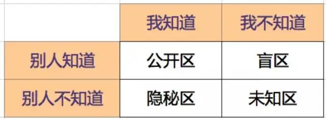 为大家介绍一个矩阵——乔哈里窗格。乔哈里把事情分为 “我知道”、“我不知道”、“别人知道”、“别人不知道” 四类,然后矩阵组合出 “公开区”、“未知区”、“隐秘区” 和 “盲区” 四类。