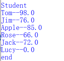 Student Tom--98.0 Jim--76.0 Apple--85.0 Rose--66.0 Jack--72.0 Lucy--0.0 end