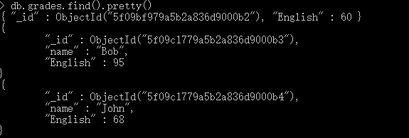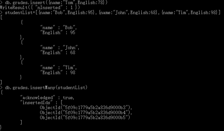 1 db.grades.insert({name:"Tom",English:78}) //在grades表中插入一条数据(集合不存在时插入数据会自动创建集合) 2 //批量插入 3 studentList=[{name:"Bob",English:95},{name:"John",English:68},{name:"Tim",English:98}] 4 db.grades.insertMany(studentList)