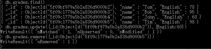 1 db.grades.find() //括号中可以添加查询条件,空则查询表中所有数据 2 db.grades.update({_id:ObjectId("5f09bf979a5b2a836d9000b2")},{$set:{English:60}}) //第一个{}中为筛选的条件,第二个{}为要修改的内容 3 db.grades.remove({_id:ObjectId("5f09c1779a5b2a836d9000b5")}) //{}中为筛选的条件