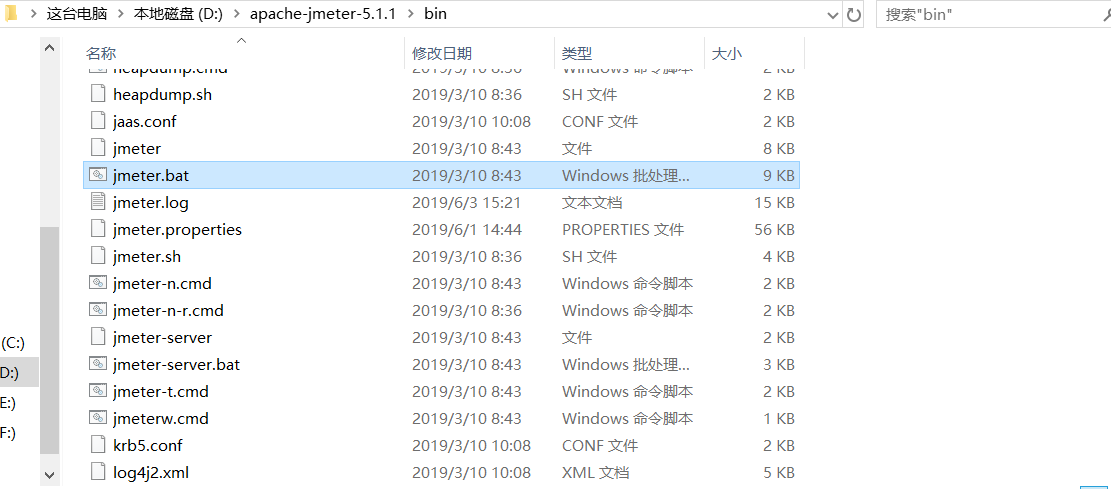 进入安装的jmeter,bin路径中双击打开jmeter.bet