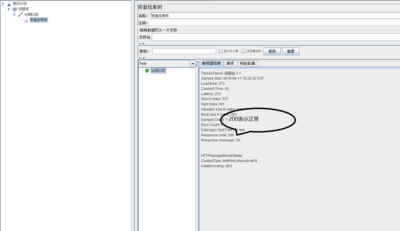 然后选择察看结果树-选择qq测吉凶-取样器结果