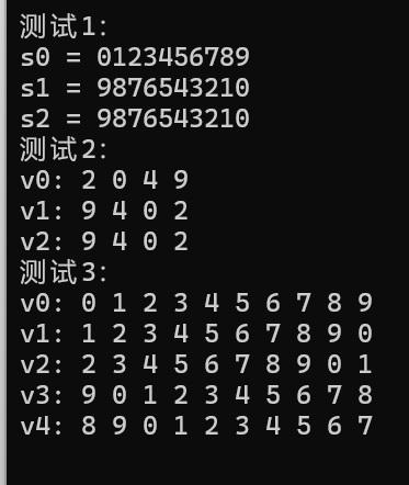 1 #include<bits/stdc++.h> 2 using namespace std; 3 4 //模板函数声明 5 template<typename T> 6 void output(const T &c); 7 8 //普通函数声明 9 void test1(); 10 void test2(); 11 void test3(); 12 13 int main(){ 14 cout<<"测试1:\n"; 15 test1(); 16 17 cout<<"测试2:\n"; 18 test2(); 19 20 cout<<"测试3:\n"; 21 test3(); 22 23 } 24 25 //输出容器对象C中的元素 26 template <typename T> 27 void output(const T &c) 28 { 29 for(auto &i: c) 30 cout<<i<<" "; 31 cout<<endl; 32 } 33 34 void test1(){ 35 string s0{"0123456789"}; 36 cout<<"s0 = "<<s0<<endl; 37 38 string s1={s0}; 39 reverse(s1.begin(),s1.end()); //从头至尾反转元素 40 cout<<"s1 = "<<s1<<endl; 41 42 string s2={s0}; 43 reverse_copy(s0.begin(),s0.end(),s2.begin()); //从头至尾复制,从第0位开始反转 44 cout<<"s2 = "<<s2<<endl; 45 } 46 47 void test2(){ 48 vector<int> v0{2,0,4,9}; 49 cout<<"v0: "; 50 output(v0); 51 52 vector<int> v1{v0}; 53 reverse(v1.begin(),v1.end()); 54 cout<<"v1: "; 55 output(v1); 56 57 vector<int> v2{v0}; 58 reverse_copy(v0.begin(),v0.end(),v2.begin()); 59 cout<<"v2: "; 60 output(v2); 61 } 62 63 void test3(){ 64 vector <int> v0{0,1,2,3,4,5,6,7,8,9}; 65 cout<<"v0: "; 66 output(v0); 67 68 vector<int> v1{v0}; 69 rotate(v1.begin(),v1.begin()+1,v1.end()); 70 //旋转指定迭代器区间[v1.begin(),v1.end()]之间的数据项 ,旋转后从迭代器v1.begin()+1位置的数据项开始 71 cout<<"v1: "; 72 output(v1); 73 74 vector<int> v2{v0}; 75 rotate(v2.begin(),v2.begin()+2,v2.end()); 76 cout<<"v2: "; 77 output(v2); 78 79 vector<int> v3{v0}; 80 rotate(v3.begin(),v3.end()-1,v3.end()); 81 cout<<"v3: "; 82 output(v3); 83 84 vector<int> v4{v0}; 85 rotate(v4.begin(),v4.end()-2,v4.end()); 86 cout<<"v4: "; 87 output(v4); 88 89 }