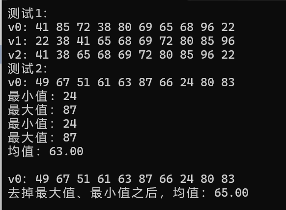 1 #include<bits/stdc++.h> 2 using namespace std; 3 4 template <typename T> 5 void output(const T &c); 6 7 int rand_int_100(); 8 void test1(); 9 void test2(); 10 11 int main() 12 { 13 cout<<"测试1:\n"; 14 test1(); 15 16 cout<<"测试2:\n"; 17 test2(); 18 19 } 20 21 template <typename T> 22 void output (const T &c){ 23 for(auto &i: c) 24 cout<<i<<" "; 25 cout<<endl; 26 27 } 28 29 int rand_int_100(){ 30 return rand()%101; 31 32 } 33 34 void test1(){ 35 vector<int> v0(10); 36 generate(v0.begin(),v0.end(),rand_int_100); 37 cout<<"v0: "; 38 output(v0); 39 40 vector<int> v1{v0}; 41 sort(v1.begin(),v1.end()); 42 cout<<"v1: "; 43 output(v1); 44 45 vector <int> v2{v0}; 46 sort(v2.begin()+1,v2.end()-1); 47 cout<<"v2: "; 48 output(v2); 49 } 50 51 void test2(){ 52 vector<int> v0(10); 53 generate(v0.begin(),v0.end(),rand_int_100); 54 cout<<"v0: "; 55 output(v0); 56 57 auto iter1=min_element(v0.begin(),v0.end()); 58 cout<<"最小值: "<<*iter1<<endl; 59 60 auto iter2=max_element(v0.begin(),v0.end()); 61 cout<<"最大值:"<<*iter2<<endl; 62 63 auto ans=minmax_element(v0.begin(),v0.end()); 64 cout<<"最小值:"<<*(ans.first)<<endl; 65 cout<<"最大值:"<<*(ans.second)<<endl; 66 double avg1=accumulate(v0.begin(),v0.end(),0)/v0.size(); 67 cout<<"均值:"<<fixed<<setprecision(2)<<avg1<<endl; 68 69 cout<<endl; 70 vector<int> v1{v0}; 71 cout<<"v0:"; 72 output(v0); 73 sort(v1.begin(),v1.end()); 74 double avg2=accumulate(v1.begin()+1,v1.end()-1,0)/(v1.size()-2); 75 cout<<"去掉最大值、最小值之后,均值:"<<avg2<<endl; 76 }