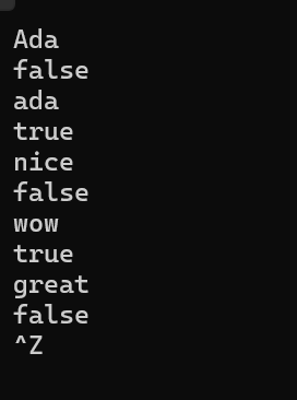 1 #include <iostream> 2 #include <string> 3 #include <algorithm> 4 5 bool is_palindrome(std::string s); 6 7 int main() { 8 using namespace std; 9 string s; 10 11 while(cin >> s) // 多组输入,直到按下Ctrl+Z后结束测试 12 cout << boolalpha << is_palindrome(s) << endl; 13 } 14 15 // 函数is_palindrom定义 16 bool is_palindrome(std::string s){ 17 int len=s.size(); 18 int t=0; 19 for(int i=0;i<len;i++) 20 { 21 if(s[i]!=s[len-1-i]) 22 t=1; 23 } 24 if(t==0) 25 return true; 26 else 27 return false; 28 }