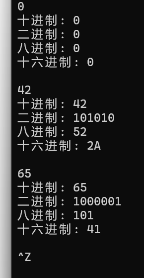 1 #include <iostream> 2 #include <string> 3 #include <algorithm> 4 5 std::string dec2n(int x, int n = 2); 6 7 int main() { 8 using namespace std; 9 10 int x; 11 while(cin >> x) { 12 cout << "十进制: " << x << endl; 13 cout << "二进制: " << dec2n(x) << endl; 14 cout << "八进制: " << dec2n(x, 8) << endl; 15 cout << "十六进制: " << dec2n(x, 16) << endl << endl; 16 } 17 } 18 19 // 函数dec2n定义 20 std::string dec2n(int x,int n){ 21 int t=0; 22 std::string ans; 23 do 24 { 25 t=x%n; 26 if(t>=0&&t<=9) 27 ans+=(t+'0'); 28 else 29 ans+=(t+'A'-10); 30 x/=n; 31 }while(x>0); 32 reverse(ans.begin(),ans.end()); 33 return ans; 34 }