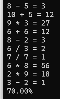 1 #include<bits/stdc++.h> 2 using namespace std; 3 int main(){ 4 srand((unsigned)time(NULL)); 5 int ans; 6 int a,b,c; 7 double sum=0; 8 char op; 9 for(int i=1;i<=10;i++){ 10 ans=0; 11 op="-+*/"[rand()%4]; 12 if(op=='*') 13 { 14 a=rand()%10+1; 15 b=rand()%10+1; 16 ans=a*b; 17 } 18 else if(op=='+') 19 { 20 a=rand()%10+1; 21 b=rand()%10+1; 22 ans=a+b; 23 } 24 else if(op=='-') 25 { 26 a=rand()%10+1; 27 b=rand()%10+1; 28 while(b>a) 29 b=rand()%10+1; 30 ans=a-b; 31 } 32 else 33 { 34 a=rand()%10+1; 35 b=rand()%10+1; 36 while(a%b!=0) 37 b=rand()%10+1; 38 ans=a/b; 39 } 40 cout<<a<<" "<<op<<" "<<b<<" = "; 41 cin>>c; 42 if(c==ans) 43 sum++; 44 } 45 printf("%.2lf%\n",sum*10); 46 return 0; 47 }