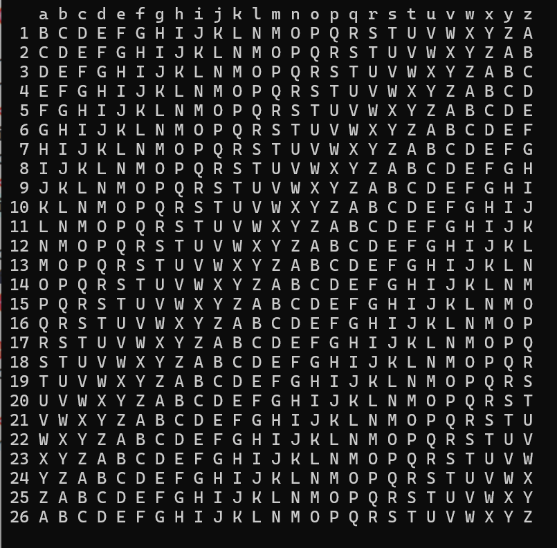 1 #include<bits/stdc++.h> 2 using namespace std; 3 int main() 4 { 5 string s1="abcdefghijklmnopqrstuvwxyz"; 6 string s2="ABCDEFGHIJKLNMOPQRSTUVWXYZ"; 7 cout<<" "; 8 for(int i=0;i<=26;i++) 9 cout<<setw(2)<<s1[i]; 10 cout<<endl; 11 for(int i=1;i<=26;i++) 12 { 13 cout<<setw(2)<<i; 14 for(int j=0;j<26;j++) 15 { 16 cout<<setw(2)<<s2[(j+i)%26]; 17 } 18 cout<<endl; 19 } 20 cout<<endl; 21 return 0; 22 }