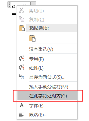 3.在两个等号前面点击 右键 -> 在此字符处对齐,此时两行的公式即会根据对应的对齐字符进行对齐。相应的,用户也可以通过右键选项删除对应的对齐点;