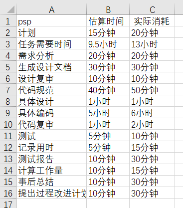 (2)根据PSP计划表估算各项工作需要花费的时间以及实际消耗的时间: