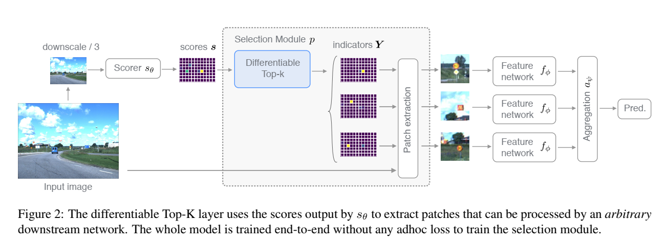 可微分的 Top-K 层使用 $s_θ$输出的分数来提取可以由任意下游网络处理的图像块(patches)。整个模型是端到端训练的,没有任何临时损失来训练选择模块。