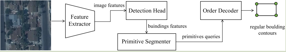 首先分割通用几何图元(可以包括顶点、线和角点),然后预测它们的序列。这样可以通过按顺序连接分割的图元来直接构建规则的建筑物轮廓。