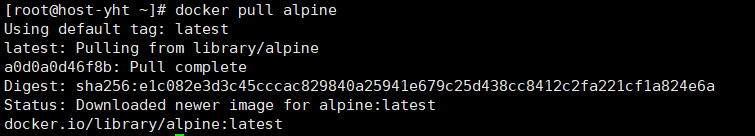 1 [root@host-yht ~]# docker pull alpine:3.10.1 2 3.10.1: Pulling from library/alpine 3 050382585609: Pull complete 4 Digest: sha256:6a92cd1fcdc8d8cdec60f33dda4db2cb1fcdcacf3410a8e05b3741f44a9b5998 5 Status: Downloaded newer image for alpine:3.10.1 6 docker.io/library/alpine:3.10.1