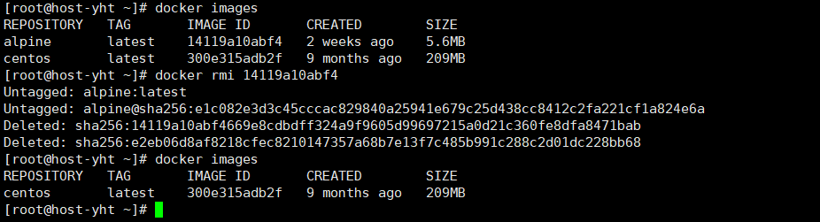 1 [root@host-yht ~]# docker images 2 REPOSITORY TAG IMAGE ID CREATED SIZE 3 alpine latest 14119a10abf4 2 weeks ago 5.6MB 4 centos latest 300e315adb2f 9 months ago 209MB 5 [root@host-yht ~]# docker tag 14119a10abf4 docker.io/library/alpine:new_latest 6 [root@host-yht ~]# docker images 7 REPOSITORY TAG IMAGE ID CREATED SIZE 8 alpine latest 14119a10abf4 2 weeks ago 5.6MB 9 alpine new_latest 14119a10abf4 2 weeks ago 5.6MB 10 centos latest 300e315adb2f 9 months ago 209MB