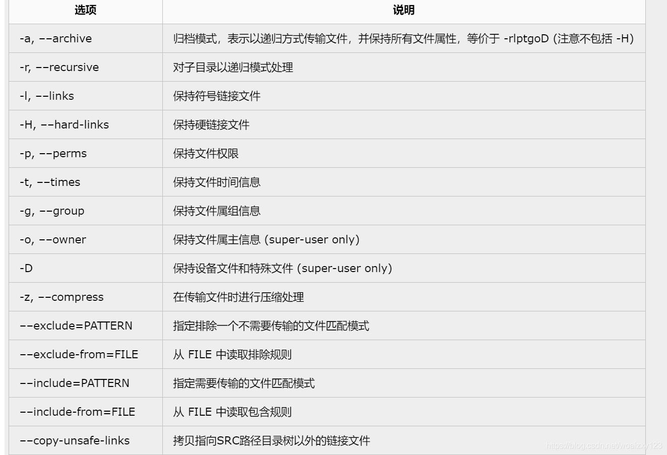上面命令中,-r表示递归,即包含子目录。注意,-r是必须的,否则 rsync 运行不会成功。source目录表示源目录,destination表示目标目录。