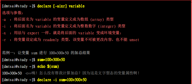 declare 或 typeset 是一样的功能,就是在『宣告变量的类型』。如果使用 declare 后面并没有接任何参数,那么 bash 就会主动的将所有的变量名称与内容通通叫出来
