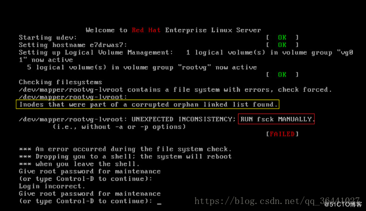 (图是盗的)如果出现类似图上的情况,首先输入root密码,然后输入 fsck -y 提示地址 ,运行完之后reboot